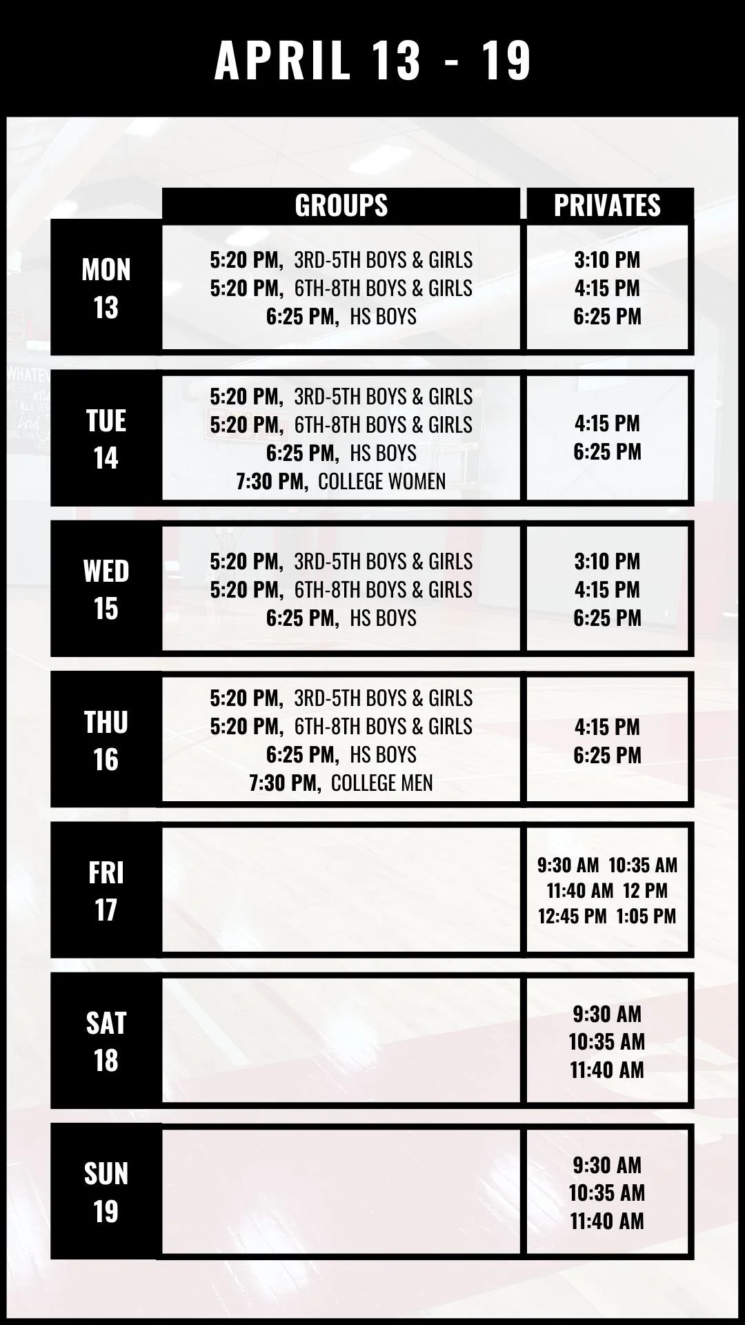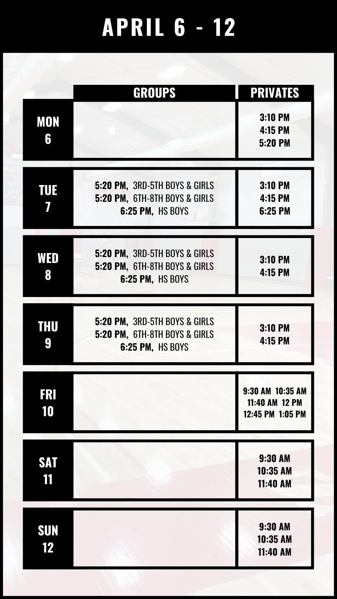 PRIVATE WORKOUTS - SCHEDULE / BOOK